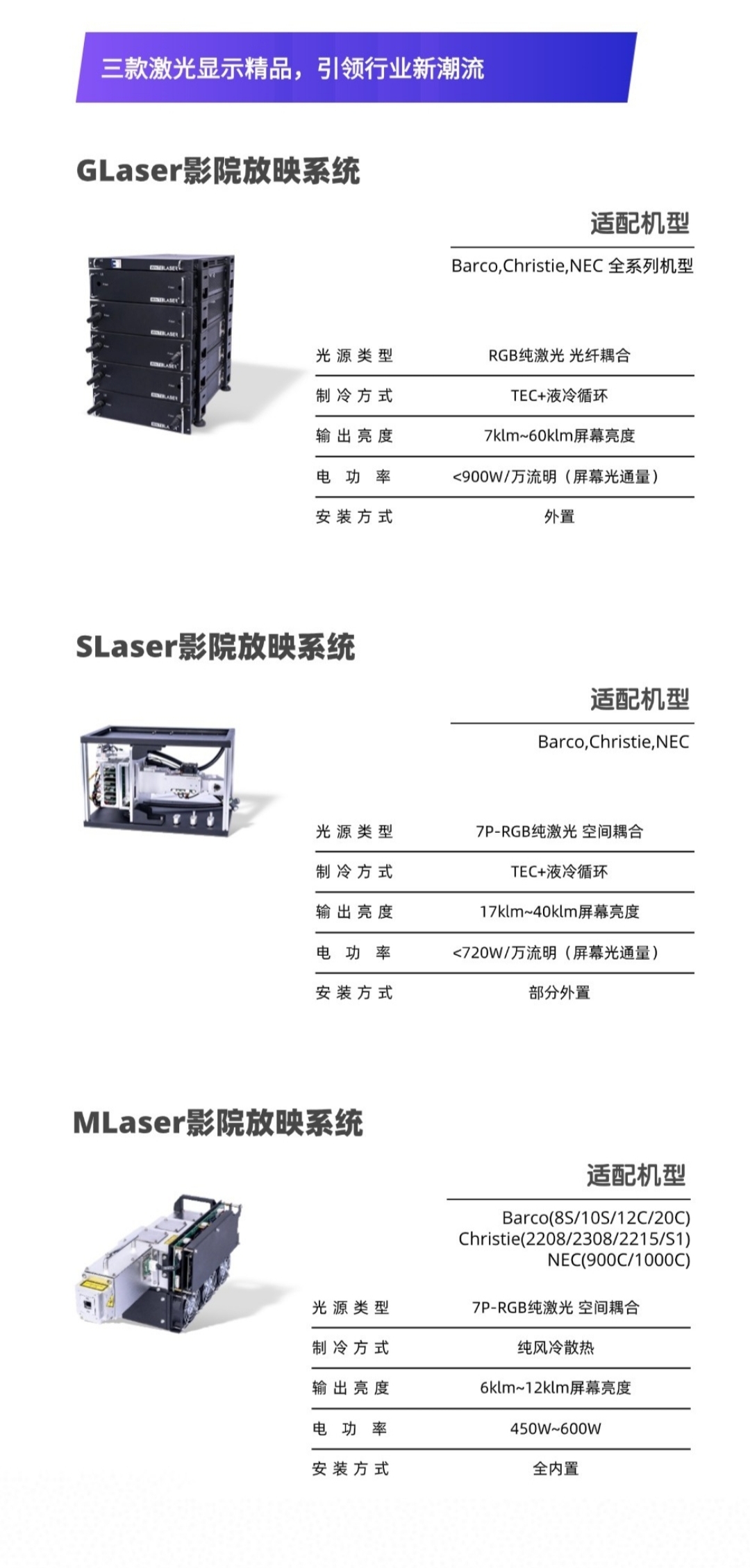 激光显示事业部负责人王吉钊对此次亮相展会的三款产品进行了简洁明了的介绍:“GLaser安装方便,采用全外置光纤连接方式;SLaser亮度高、光源内置;MLaser纯风冷散热,安装运维简便。”